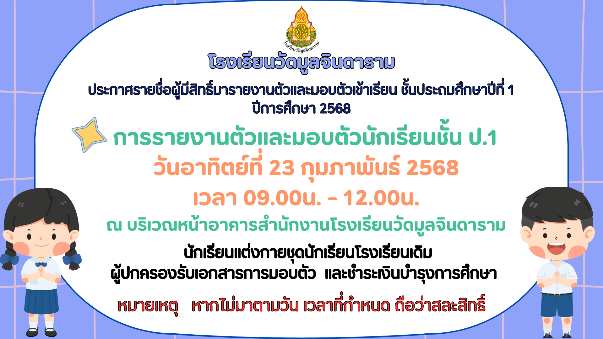 ประกาศรายชื่อผู้มีสิทธิ์มารายงานตัวและมอบตัวเข้าเรียน ชั้นประถมศึกษาปีที่ 1 โรงเรียนวัดมูลจินดาราม ปีการศึกษา 2568