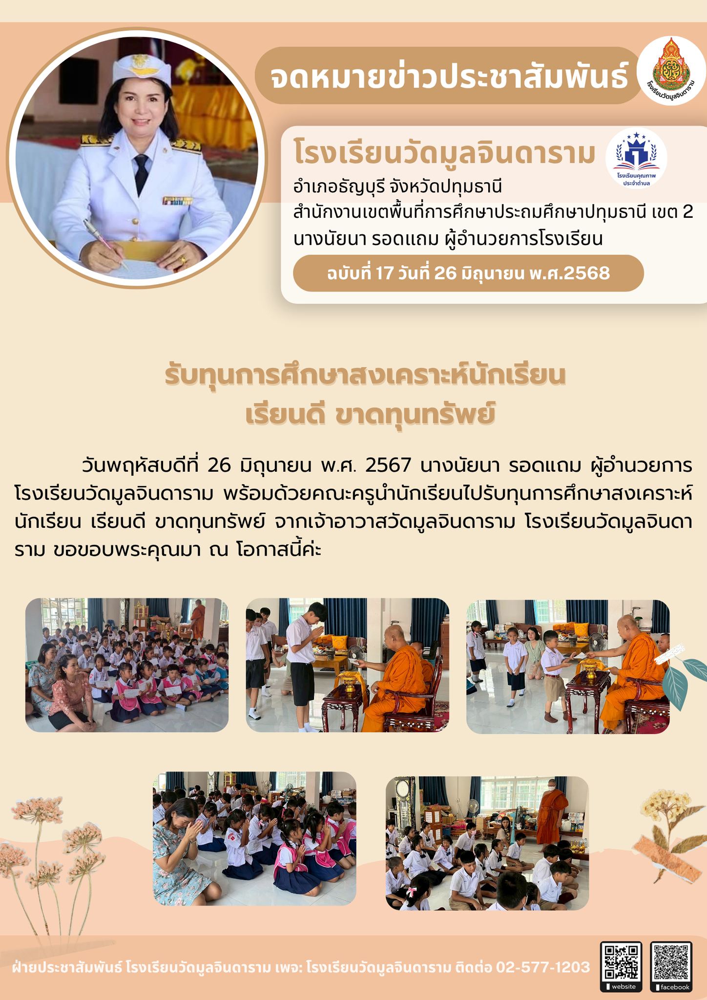 เรื่อง รับทุนการศึกษาสงเคราะห์นักเรียนเรียนดี ขาดทุนทรัพย์