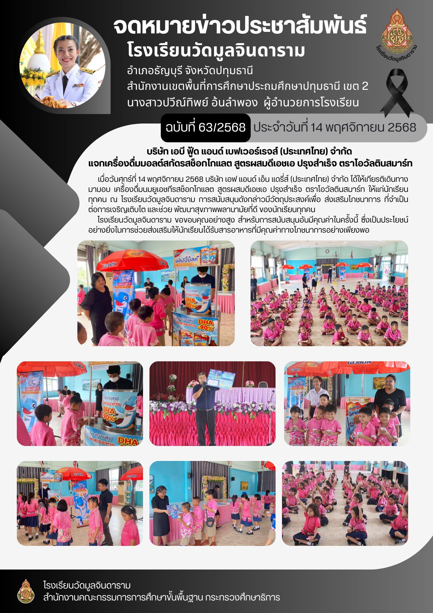 บริษัท เอฟ แอนด์ เอ็น แดรี่ส์ (ประเทศไทย) จำกัด ได้ให้เกียรติเดินทางมามอบ เครื่องดื่มนมยูเอชทีรสช็อกโกแลต สูตรผสมดีเอชเอ ปรุงสำเร็จ ตราโอวัลตินสมาร์ท ให้แก่นักเรียน