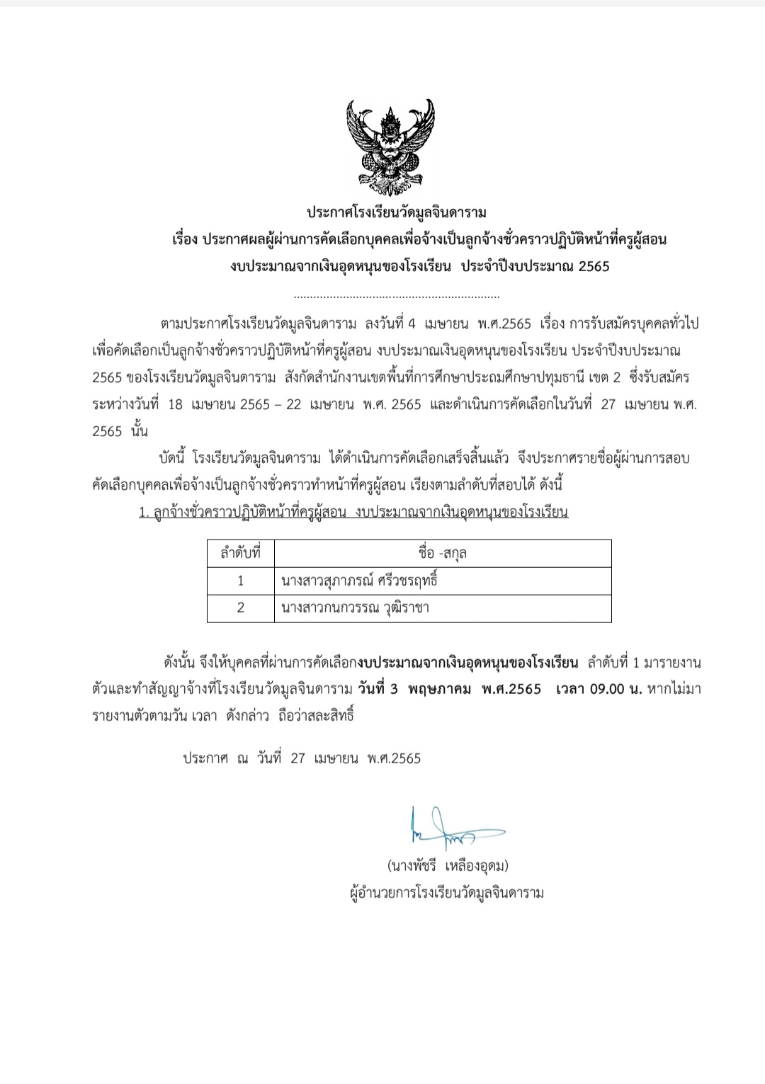 ประกาศผลผู้ผ่านการคัดเลือกบุคคลเพื่อจ้างเป็นลูกจ้างชั่วคราวปฏิบัติหน้าที่ครูผู้สอน งบประมาณจากเงินอุดหนุนของโรงเรียน ประจำปีงบประมาณ 2565